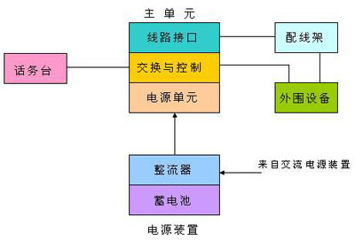 數字程控交換機由五個基本功能單元組成:主單元、配線架、話務臺、電源單元、外圍設備(數據通信、計費裝置以及電話和終端)。