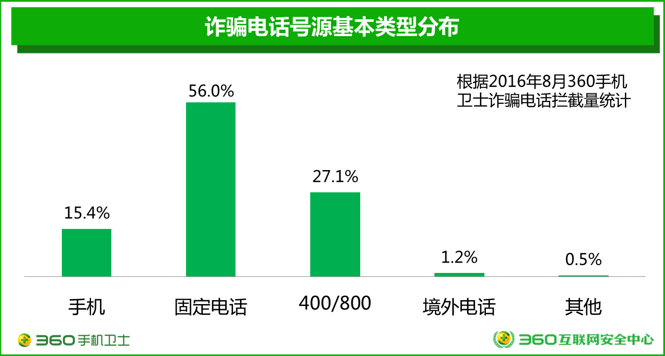 根據2016年8月360手機衛士攔截詐騙電話情況的抽樣分析顯示:在詐騙電話的號碼源中,固定電話呼出的詐騙電話數量最多,占所有詐騙電話呼叫量的56.0%;其次是400/800電話,占比為27.1%;手機呼出的詐騙電話占詐騙電話呼叫總量的15.4%;此外,還有1.2%的詐騙電話來自境外呼入。可見,固定電話和400/800號碼更應該成為詐騙電話治理的重點對象。