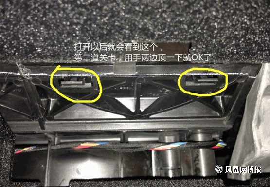 接下來我們再來拆接外部的空調濾芯, 黃色標出的地方就是機關所在,圓圈的部分就只要用手指一捏就可以松掉提起,箭頭部分是拔出來后的樣子,所以童鞋們不用擔心用力一拔就可以了。
