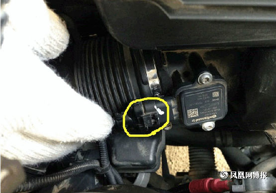 接下來就是要準備拆下空氣濾芯了,第一次拆的童鞋要注意了,圖中標出來的就是連接空氣濾芯的接口,不要像我這樣拽了半天也沒拔出來,原來這上面有個小機關,有個凸起的小開關左手往下按的同時右手往后面拉,它就出來了。(另外,告訴大家,在經過行駛后停車的拆裝的童鞋要等車子發動機冷卻后再動手,不讓帶了手套,你還是會覺得旁邊的發動機很燙,會不小心被燙到。)