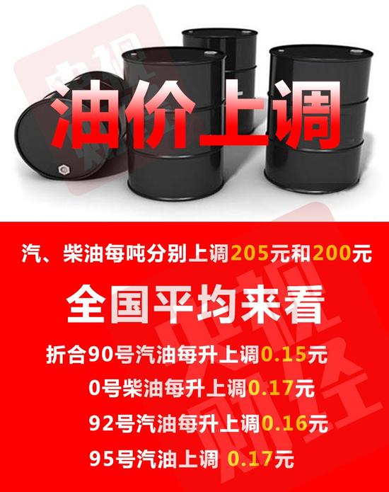 全國平均來看,折合90號汽油每升上調0.15元,92號汽油每升上調0.16元,95號上調0.17元,0號柴油每升上調0.17元。按一般家用汽車油箱50L容量估測,加滿一箱92號汽油將多花約8塊錢。